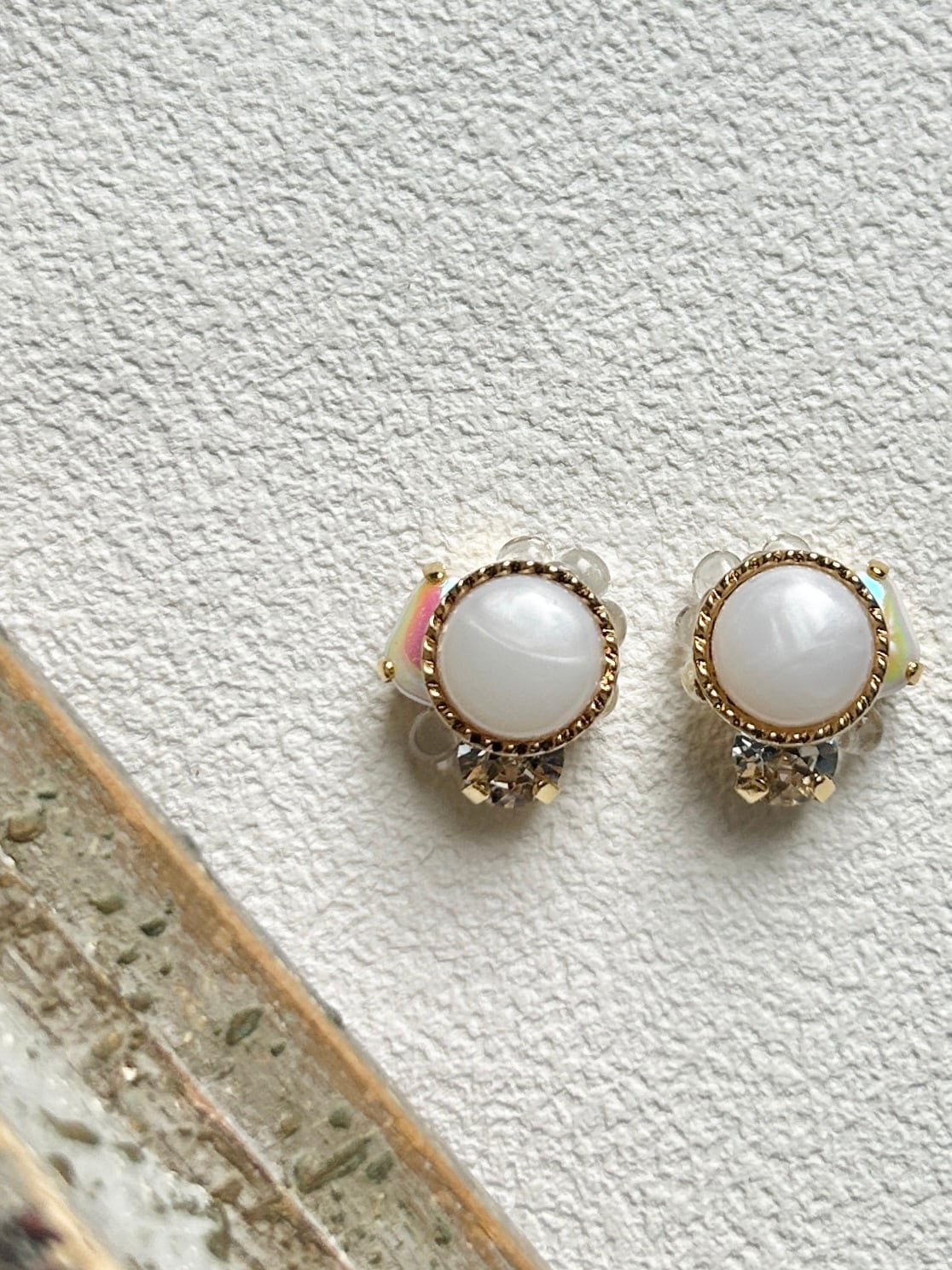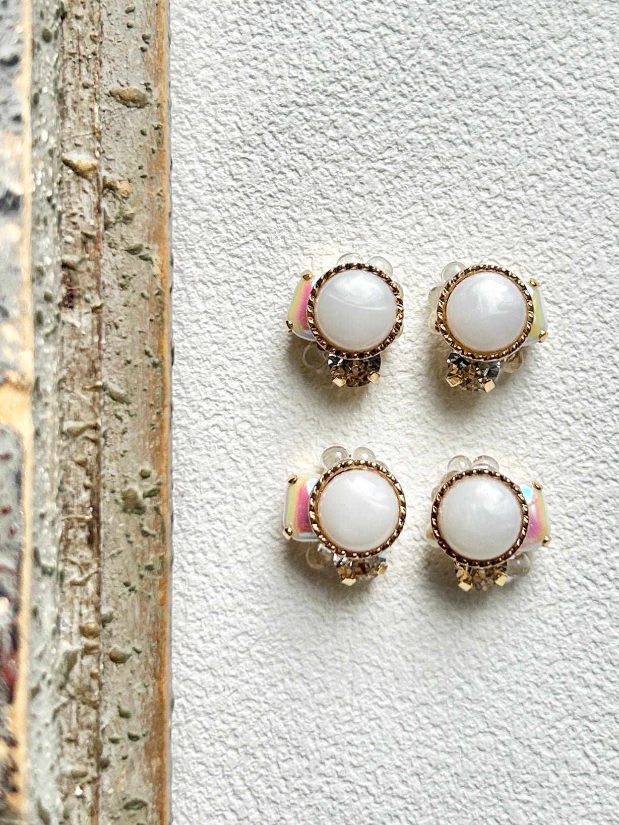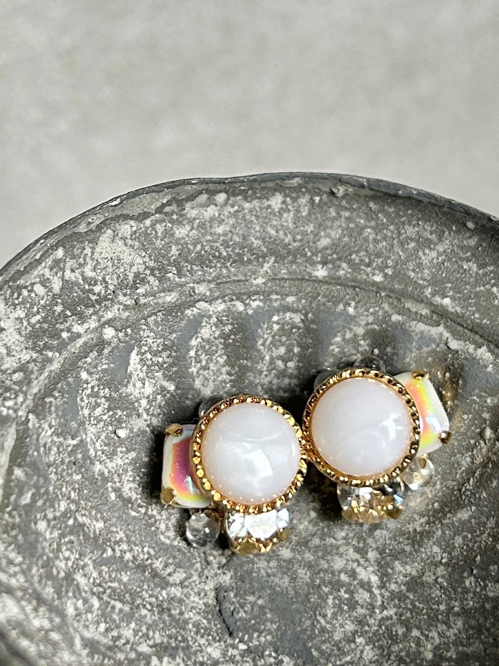 パール調のミニボタンにチェコ製のオーロラに光るヴィンテージ ストーン、クリアのスワロフスキー を編み重ねました。