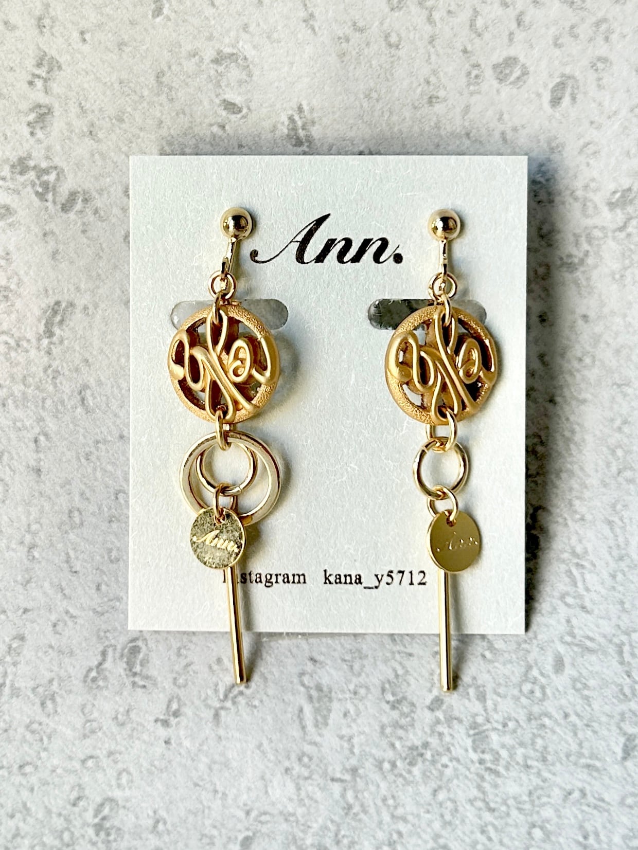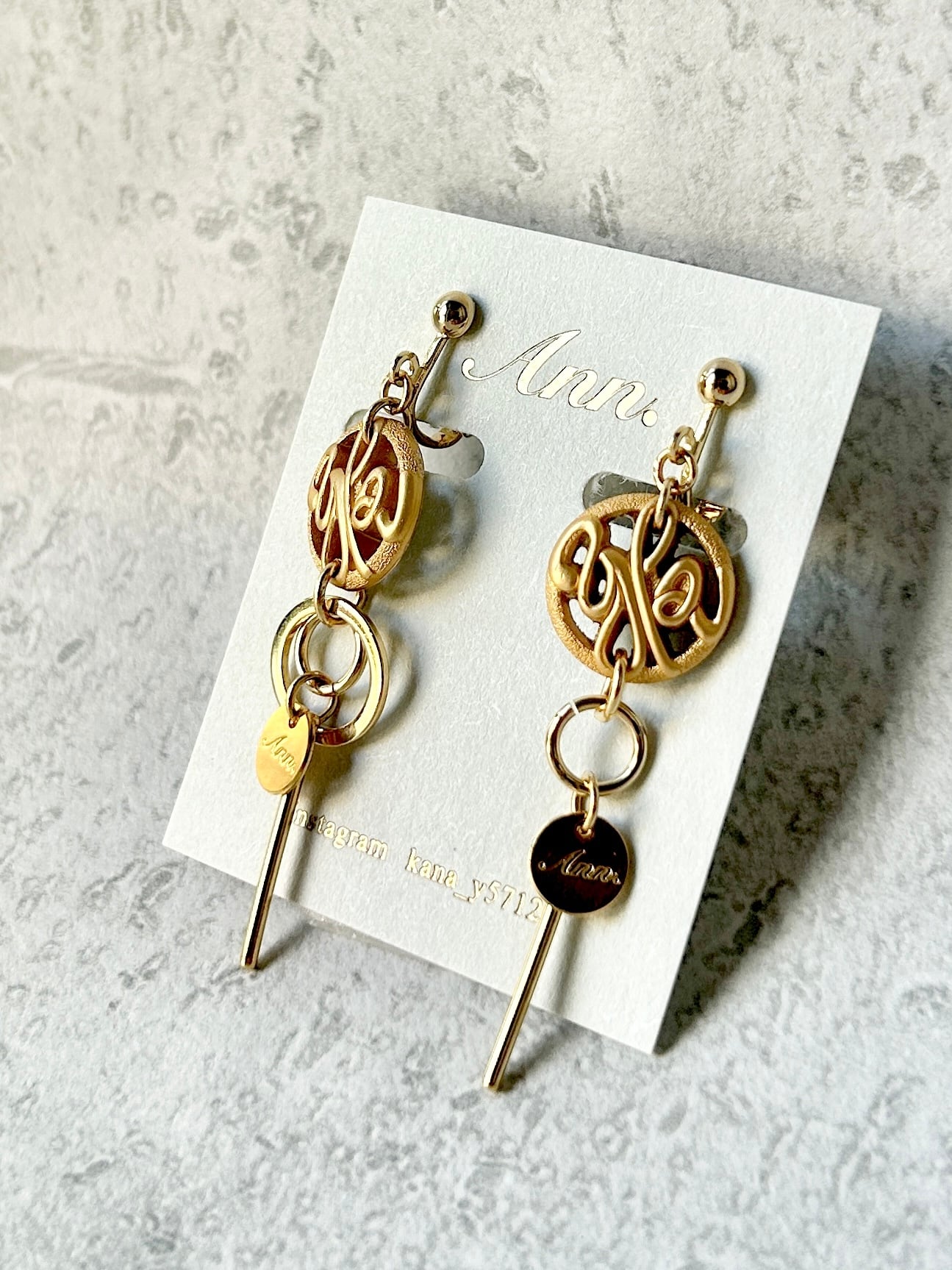 マットゴールドのボタンフープとスティックパーツを合わせた揺れるデザインです