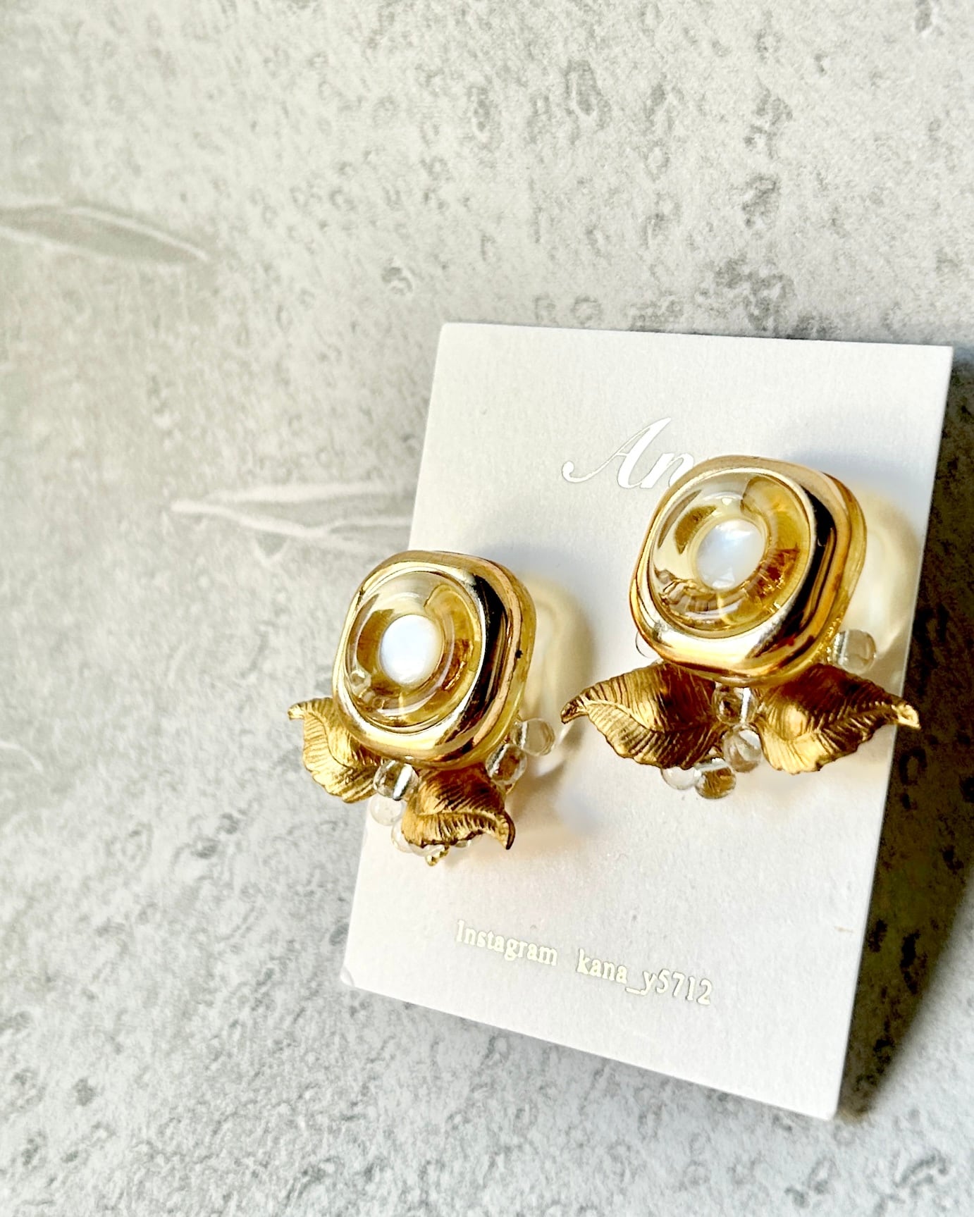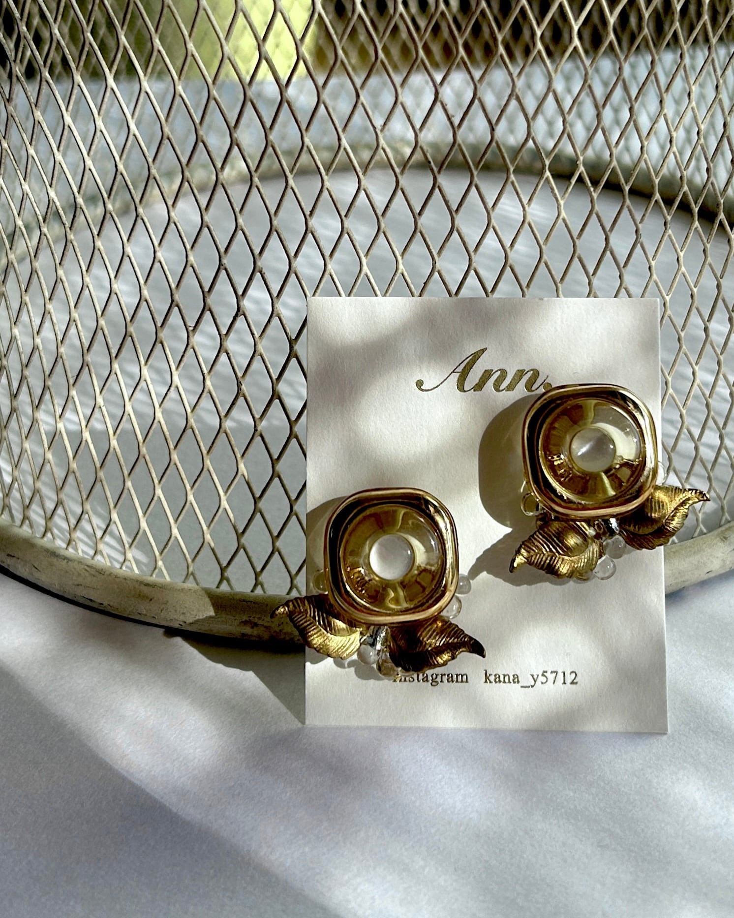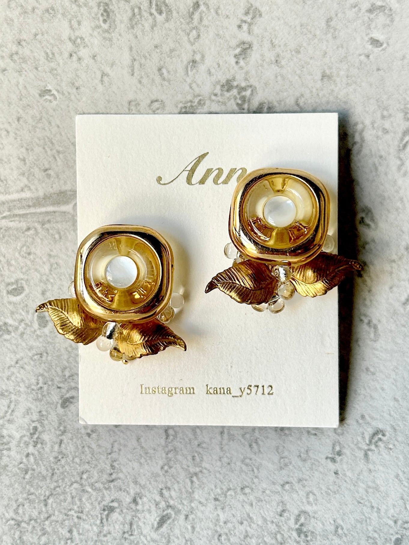 イタリアヴィンテージボタンと真鍮の葉っぱのようなパーツを編み重ねたデザインです