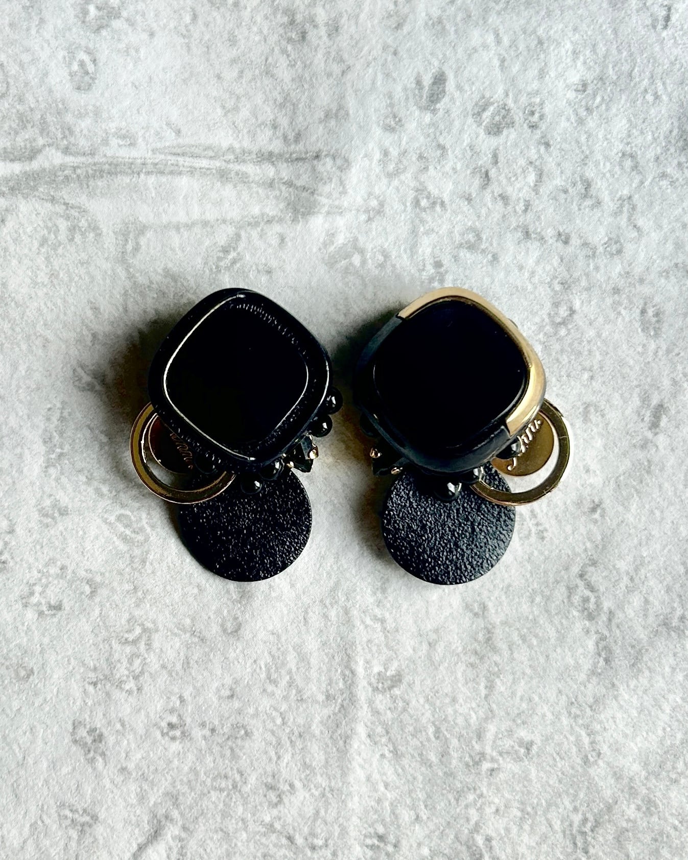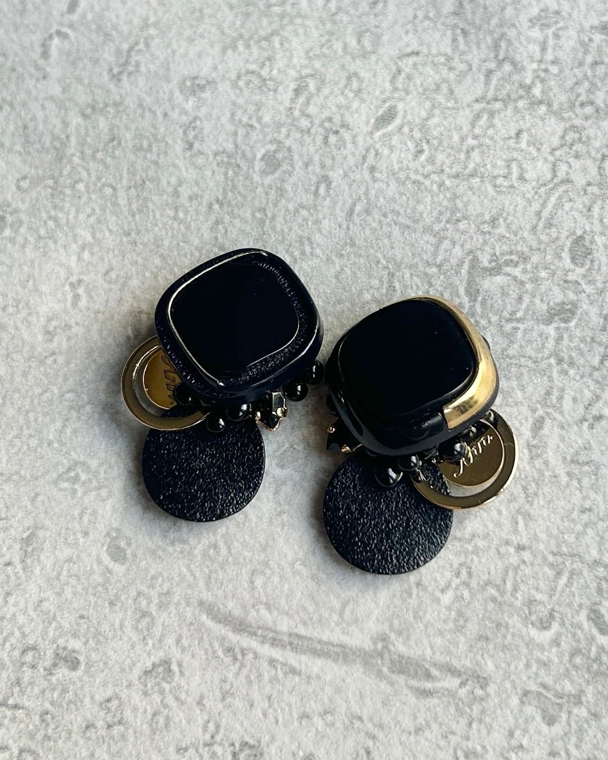 左右デザインの違うボタンをメインにブラックとゴールドでまとめたかっこいいデザイン イヤリングかピアスか選択していただけます ピアスはサージカルステンレスです