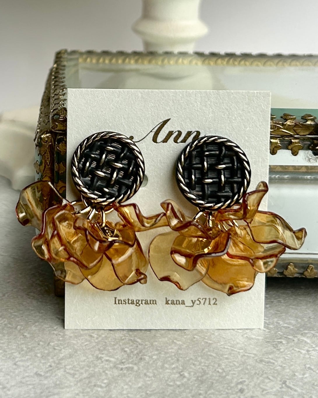 ブラックのボタンに花びらみたいなクリアブラウンのチャームを合わせました