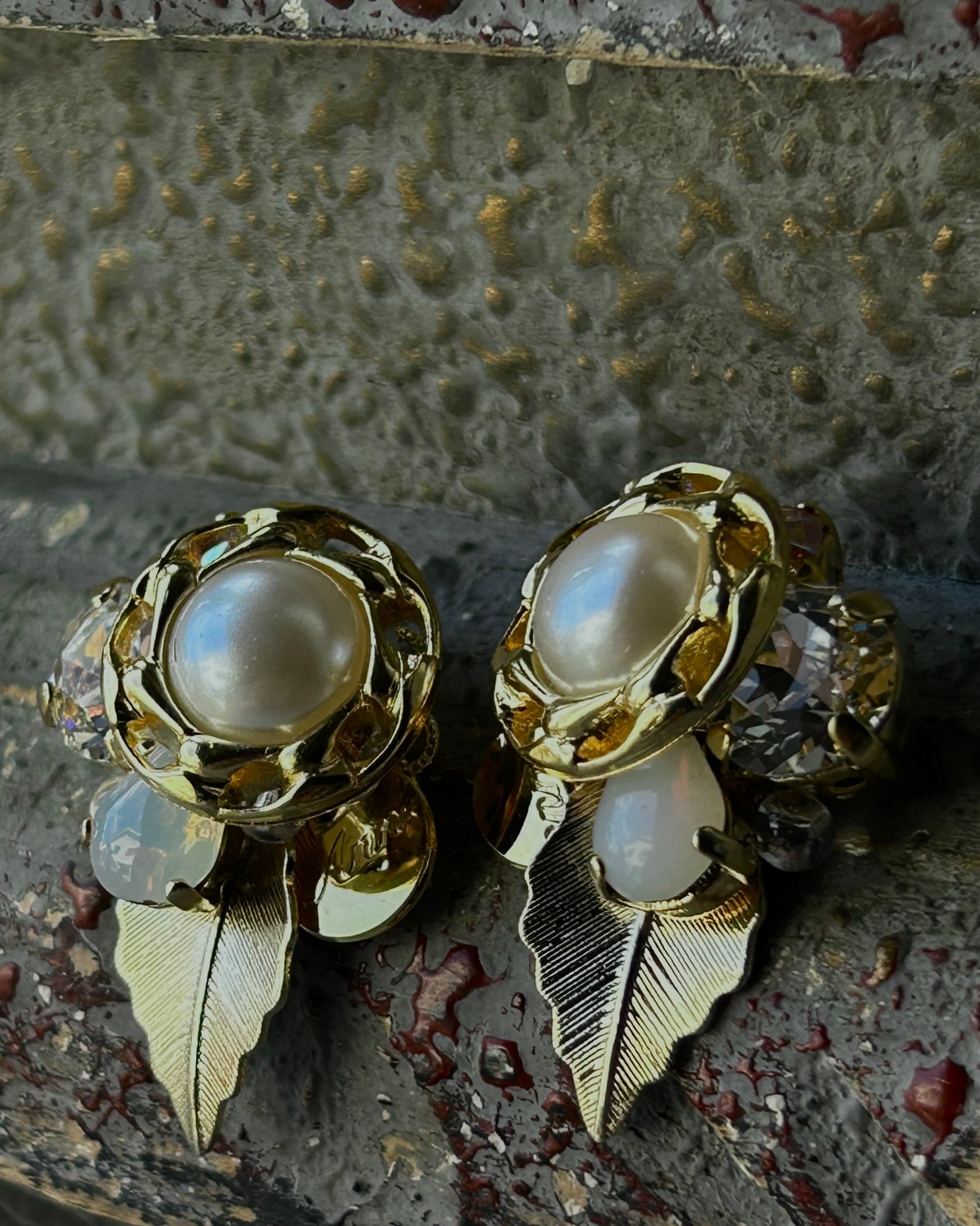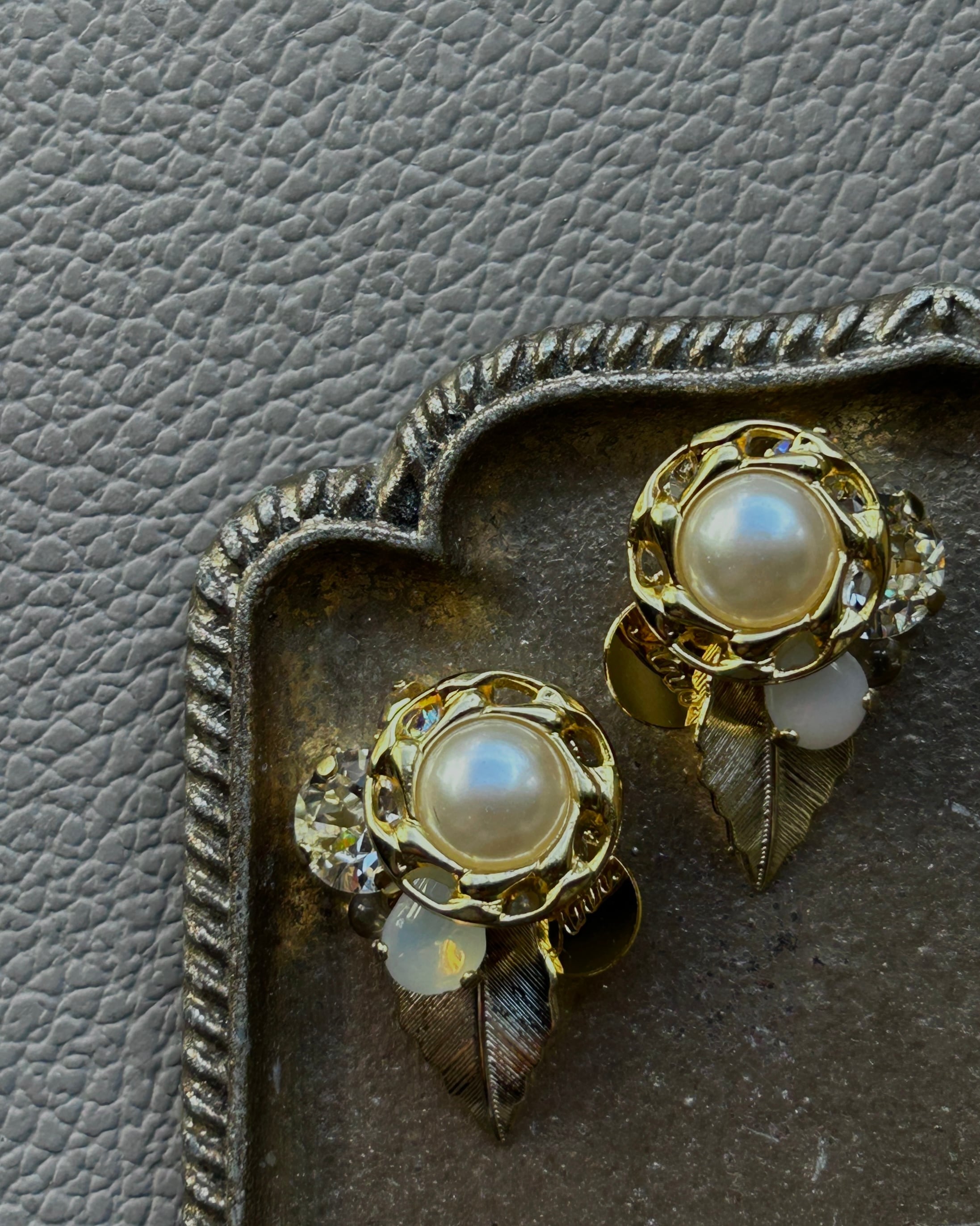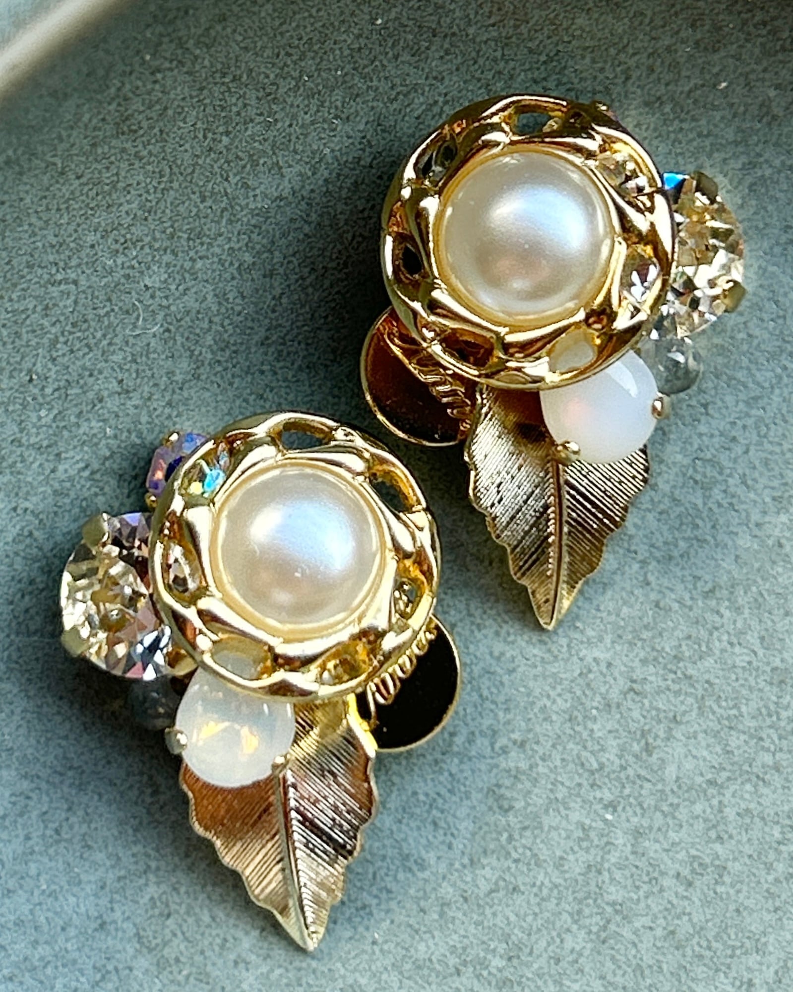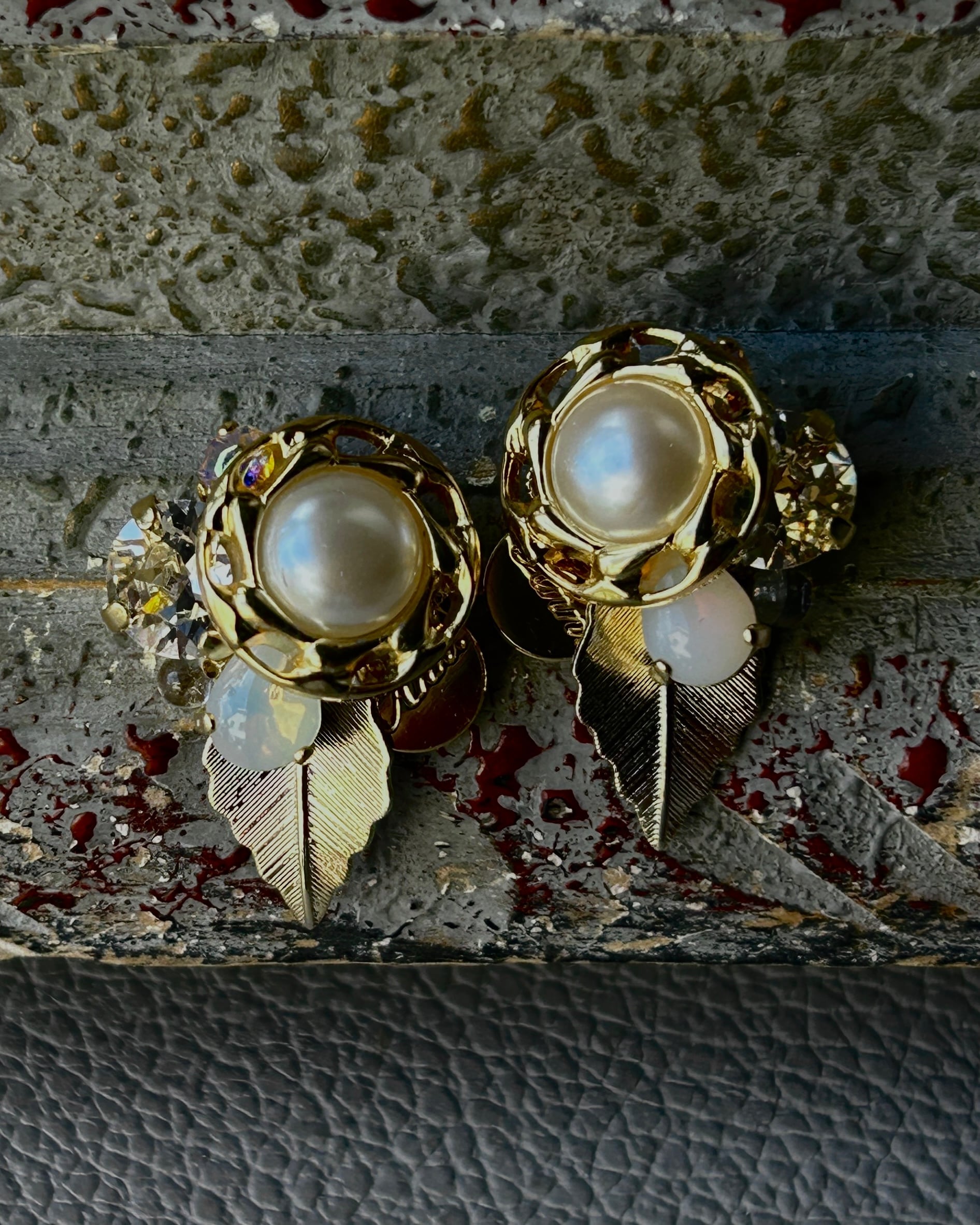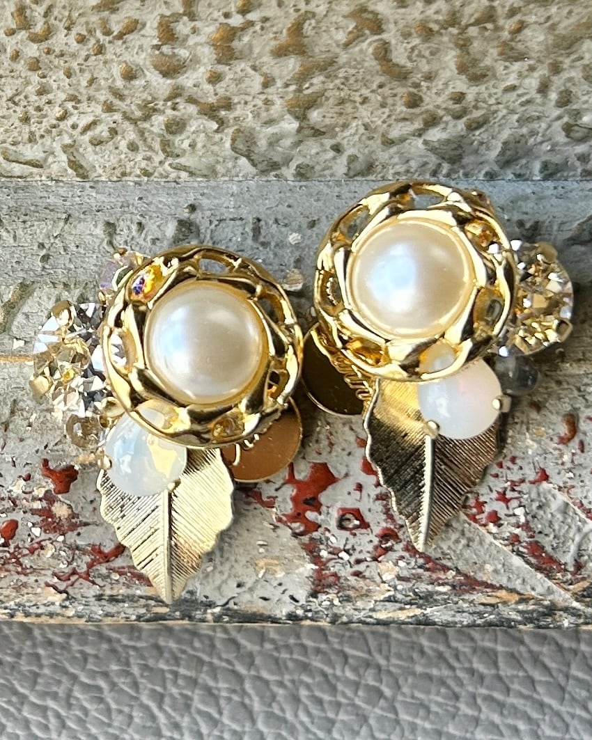 パールとゴールドのボタン、クリアのスワロフスキー、2種類のヴィンテージストーンを編み重ねました