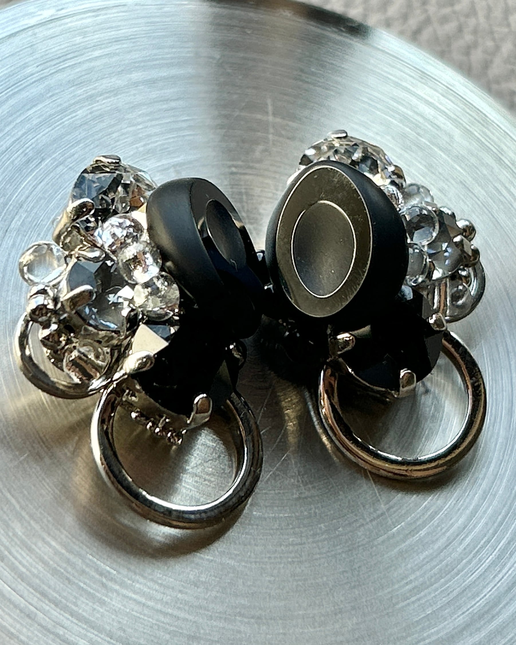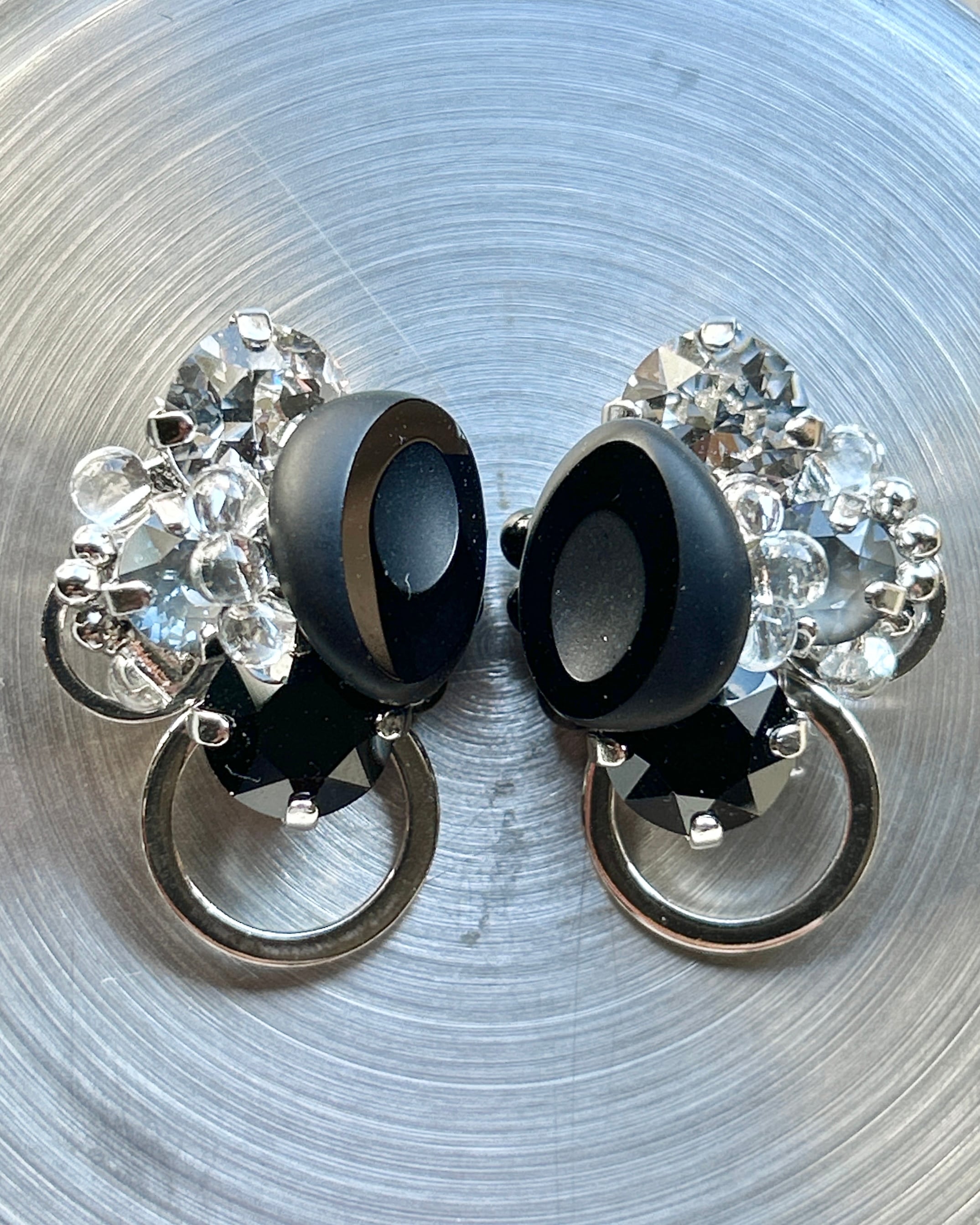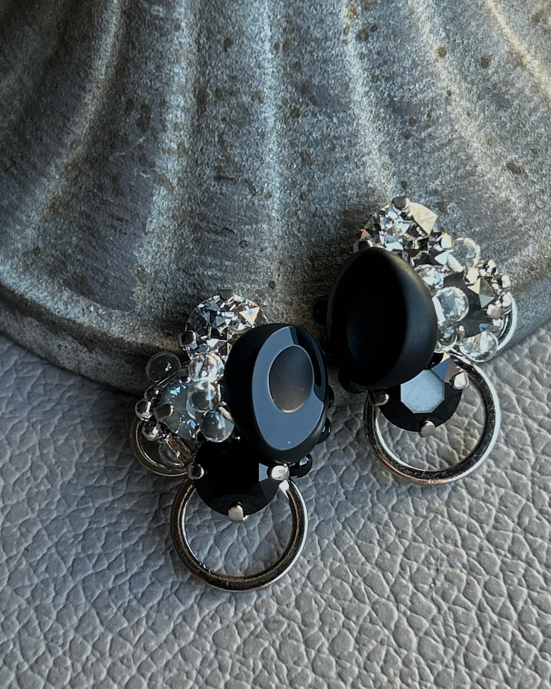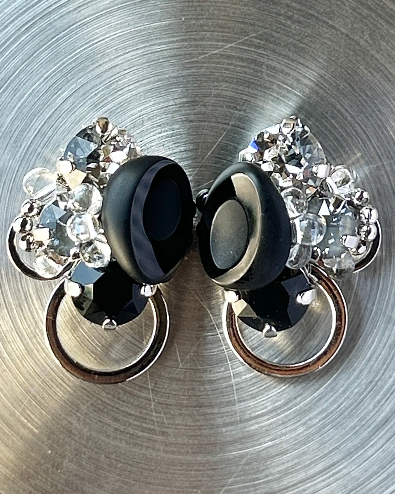 ドイツヴィンテージのガラスボタン、スワロフスキー製のストーンを編み重ねた、クールなイヤーアクセサリーです