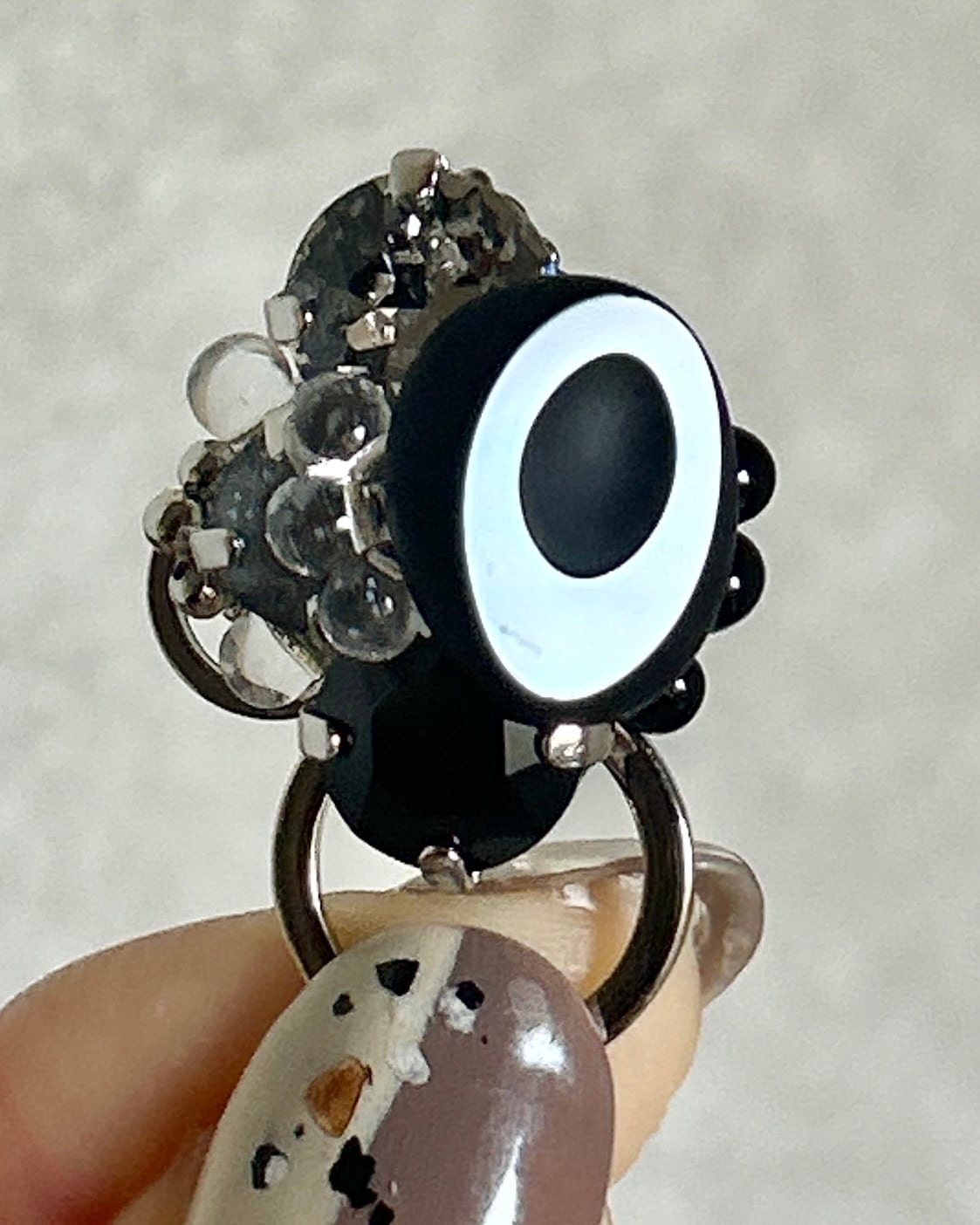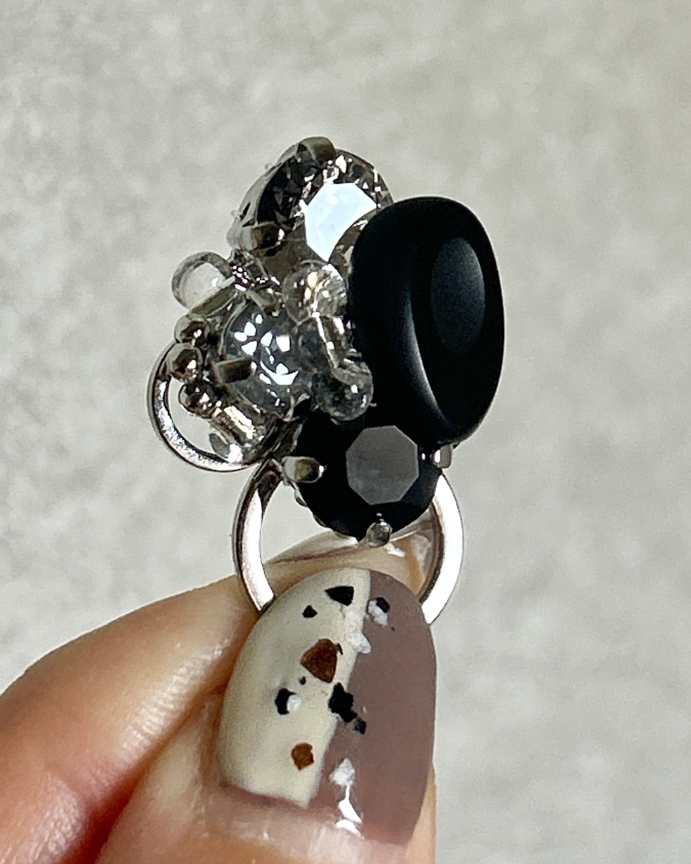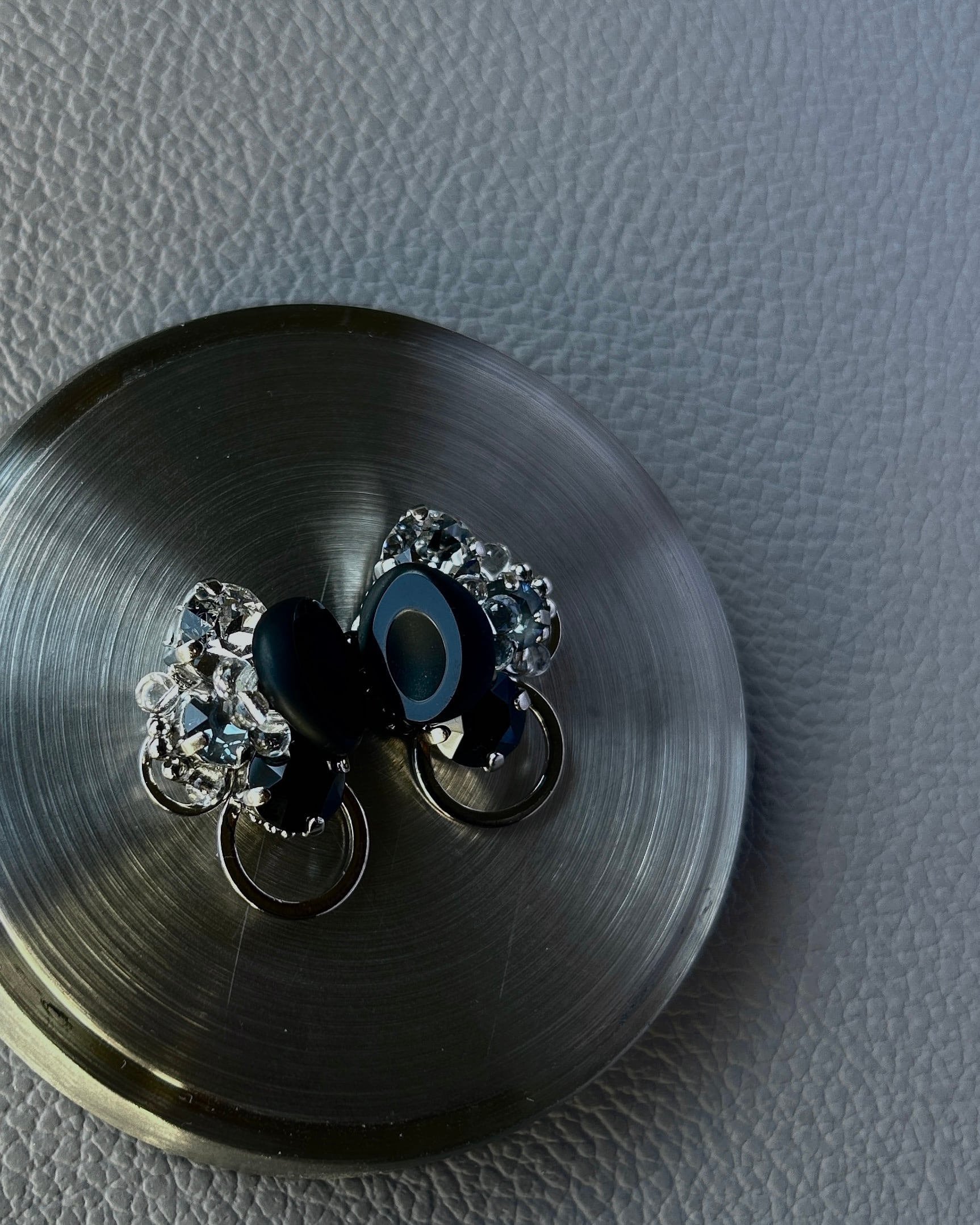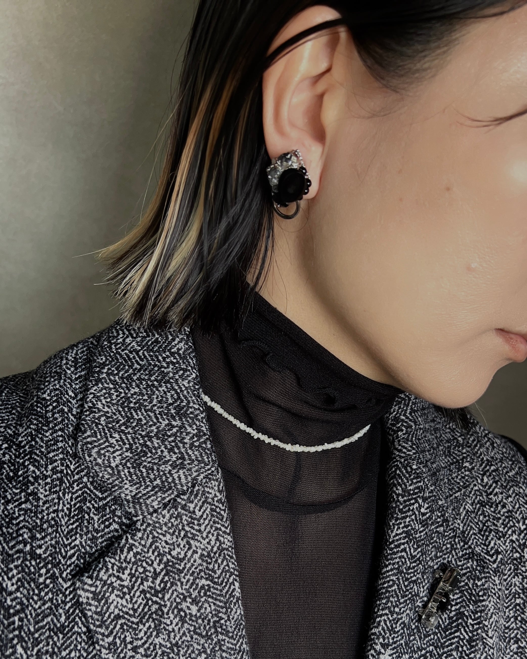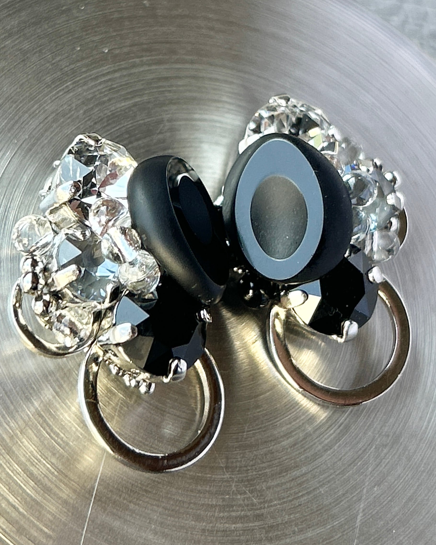 ドイツヴィンテージのガラスボタン、スワロフスキー製のストーンを編み重ねた、クールなイヤーアクセサリーです