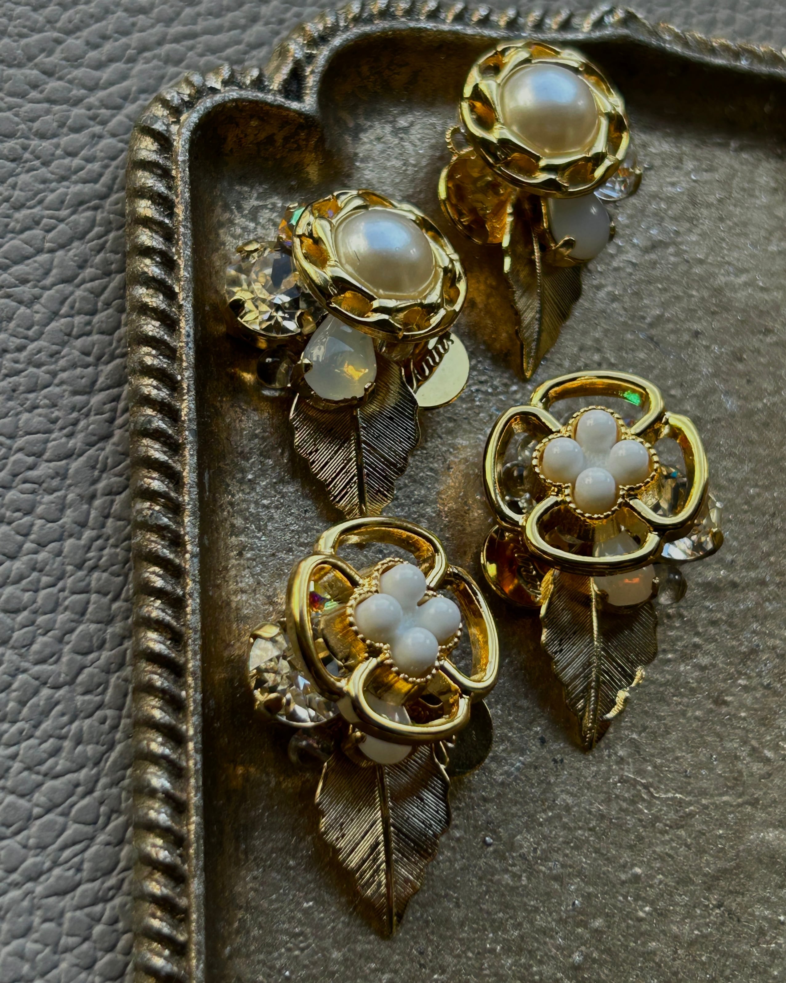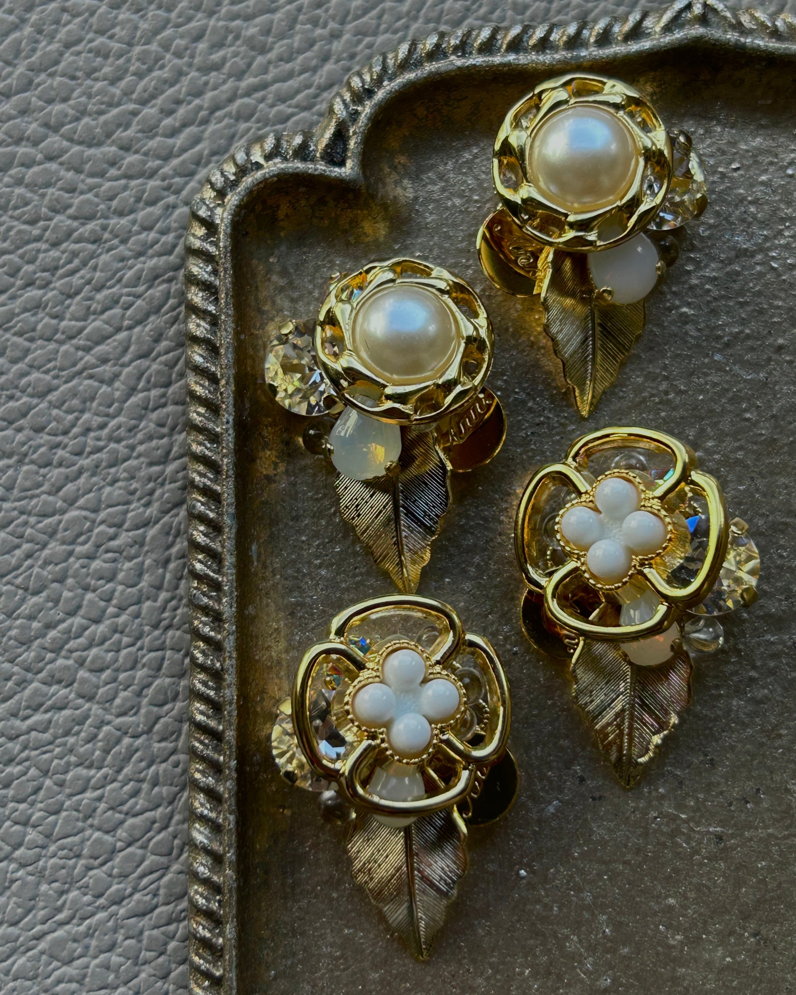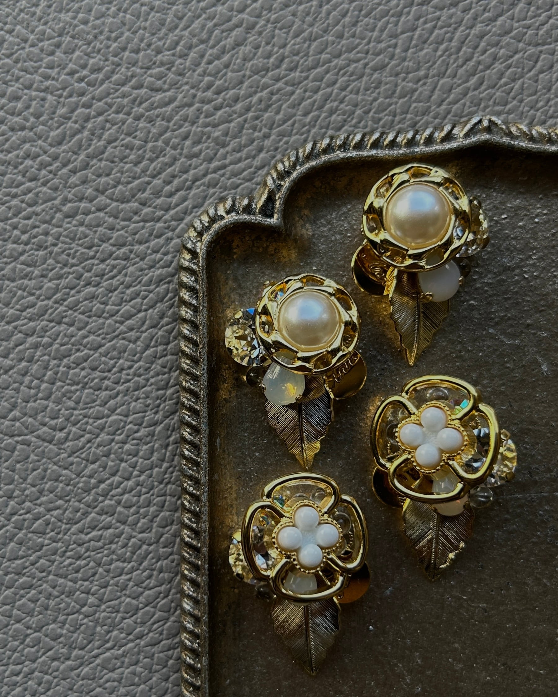 花のモチーフのボタン、クリアのスワロフスキー、2種類のヴィンテージストーンを編み重ねたイヤーアクセサリーです