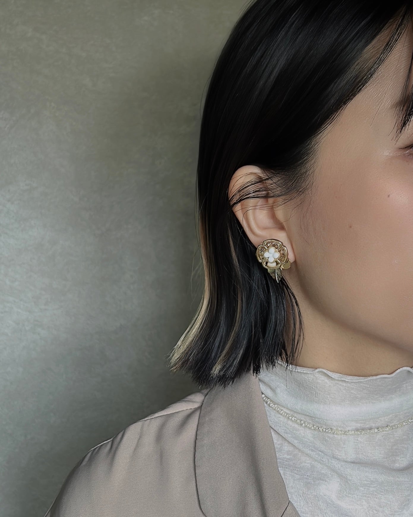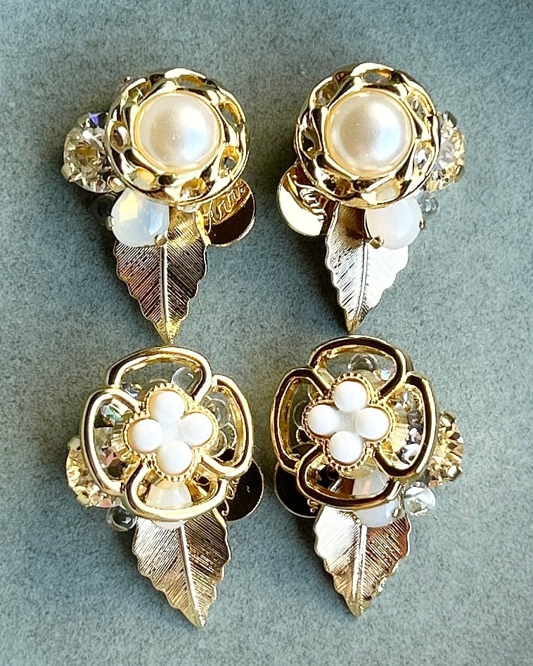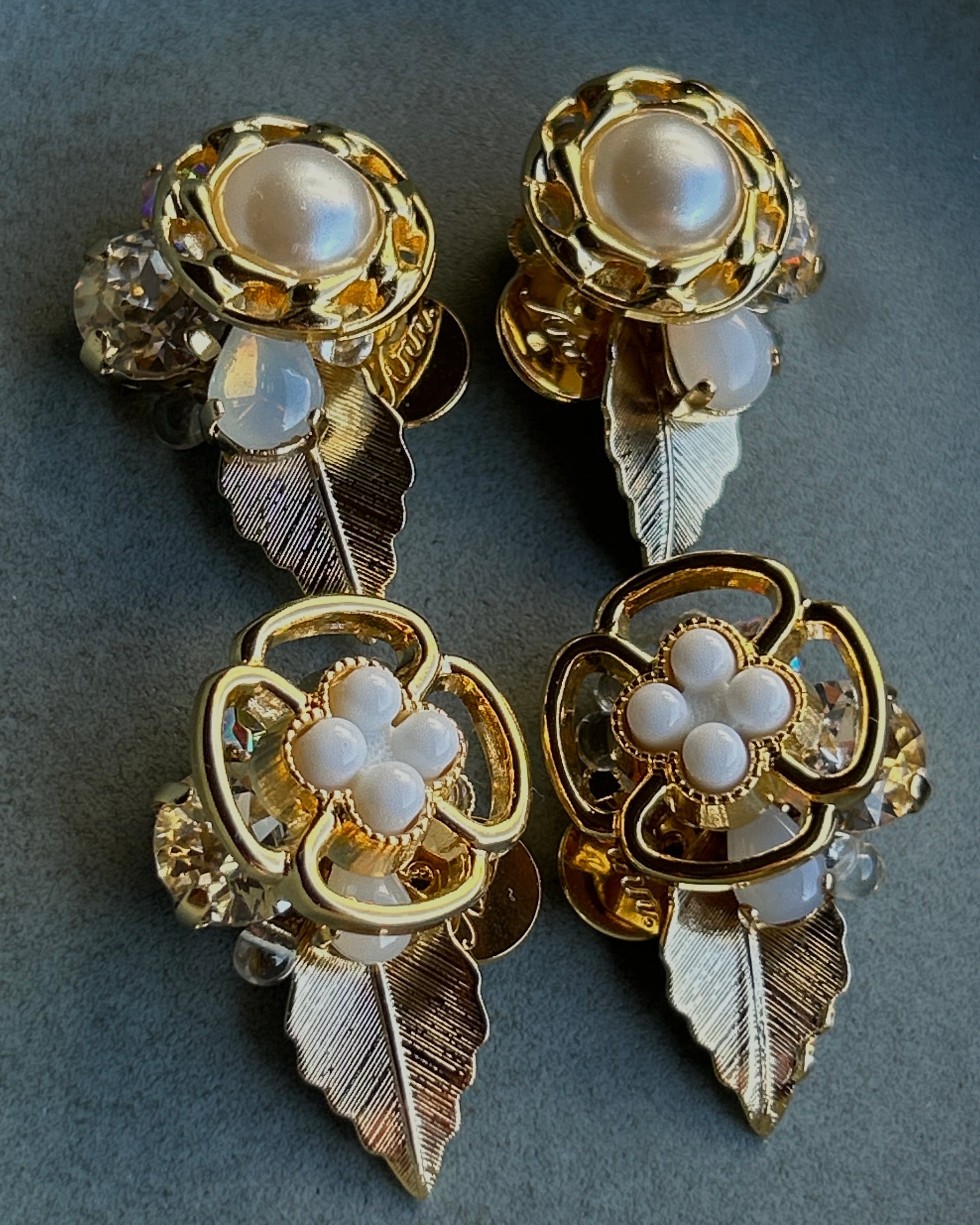 花のモチーフのボタン、クリアのスワロフスキー、2種類のヴィンテージストーンを編み重ねたイヤーアクセサリーです